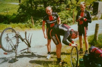 Fast am Ende der Abfahrt hatte Udo wieder einmal eine Reifenpanne. Dieses mal konnten wir auch die Ursache der vielen Löcher bei Udo erkennen. Bei den neuen Rädern waren falsche Felgenbänder eingelegt. Der Schlauch drückte durch die Felgenbänder auf die Bohrungen der Hohlkammerfelgen und so wurde der Gummi des Schlauches verletzt und einer Platter war da. Erst zerschnitt Udo seinen alten Schlauch um sich daraus extra Felgenbänder zu schneiden. Der Versuch schlug fehl. Jetzt fiel der Blick von Udo auf die Mauersteine, an die wir unsere Räder gelehnt hatten. Diese wurden von straffen Kunststoffbändern zusammengehalten. Das war die Lösung, Udo schnitt sich ein solches Band ab, brachte es auf die richtige Länge und bohrte das Loch für das Ventil hinein. Über das Band kam noch das normale Felgenband und dann das Hinterrad zusammengebaut. Das sollte das letzte Loch bei Udo in diesem Urlaub gewesen sein. Der Weg bis Ardara war nicht mehr weit und dort deckten wir uns noch einmal mit Geld ein.