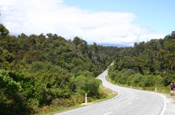 Trotz der späten Stunde waren wir alle schon um 8:00 Uhr munter und konnten auch gegen 10:00 Uhr den Platz verlassen. Wiederum hatten wir schönstes Sommerwetter und die 14 km bis Haast hatten wir im Handumdrehen hinter uns gelassen. Wieder waren wir auf der 6 und radelten nach Norden. Das Wetter blieb uns treu, somit machte das Radfahren unheimlich viel Spaß, vor allem bei solch einer Umgebung. Aber jetzt wurde die Straße zu einer Art Achterbahn, es ging hoch und runter, aber es machte trotzdem unheimlich viel Freude. Am Knights Point Lookout stoppten auch wir, wie so ziemlich jeder Tourist, um ein Foto zu schießen. Hier kam auch der slowakische Radler auf uns zu. Er fuhr mit einem Bus bis zum Fox Glacier, nachdem er tatsächlich durch den Homer-Tunnel bis zum Milford Sound geradelt war. Hut ab, kann ich da nur sagen. Nachdem sein Bus abgefahren war, fraget mich ein Tourist, ob er mich ablichten könne. Ich fragte mich warum, Radler sind ja hier nun wirklich keine seltene Gattung. Des Rätsels Lösung war einfach, ich trug meine Murphys-Radsachen und das Lieblingsbier des Mannes ist Murphys Stout.